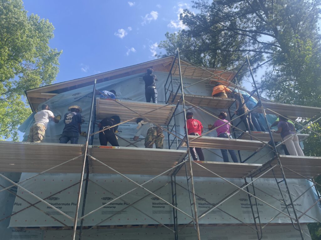 Installing the house wrap was one of the more tedious but essential tasks. Volunteers built and rebuilt scaffolding, carefully wrapping and nailing each section to protect the home from the elements. It wasn’t just physical work—it took teamwork, problem-solving, and trust. Contractors later installed the siding, and soon after, volunteers painted the exterior and trim, giving the home its first real glimpse of life.