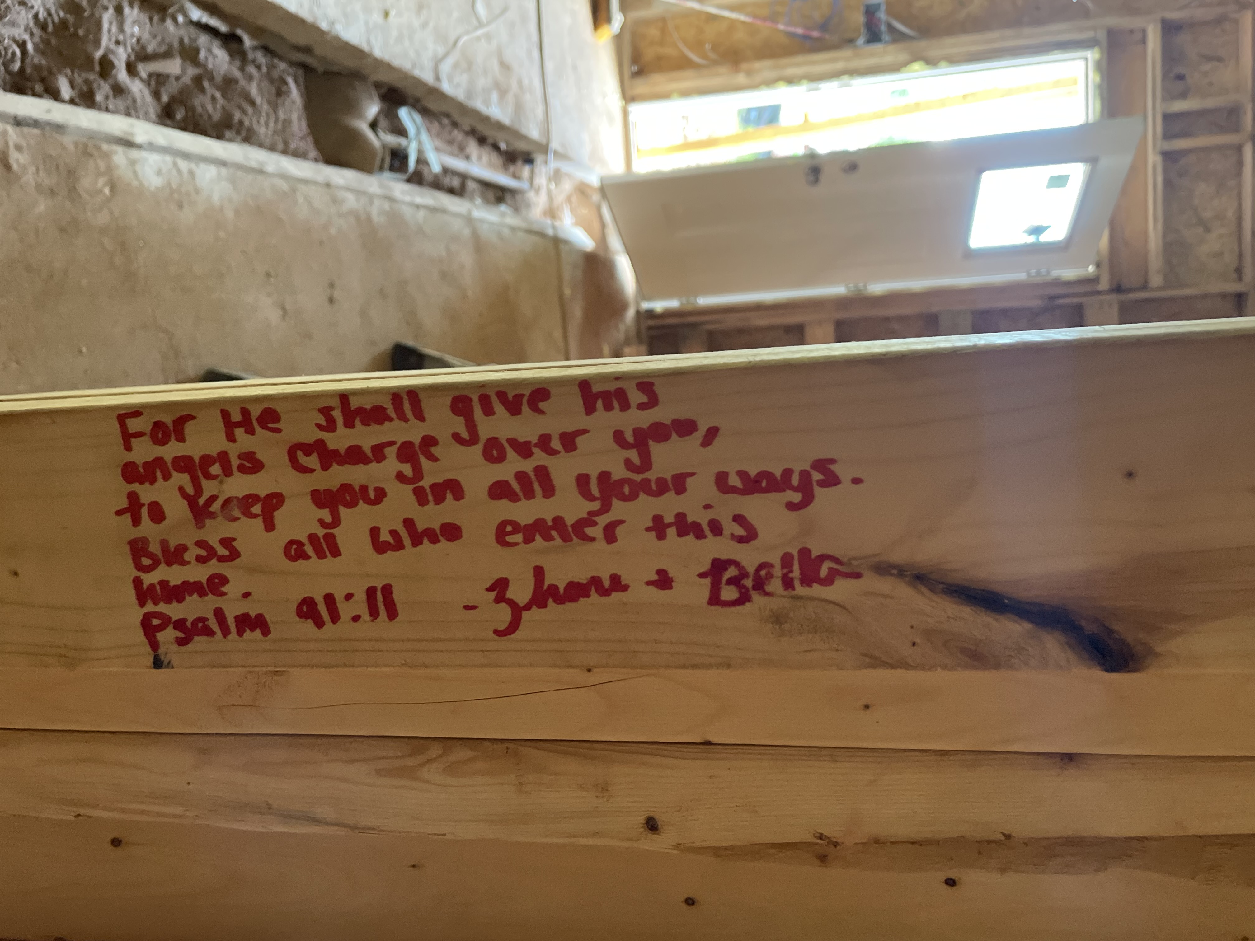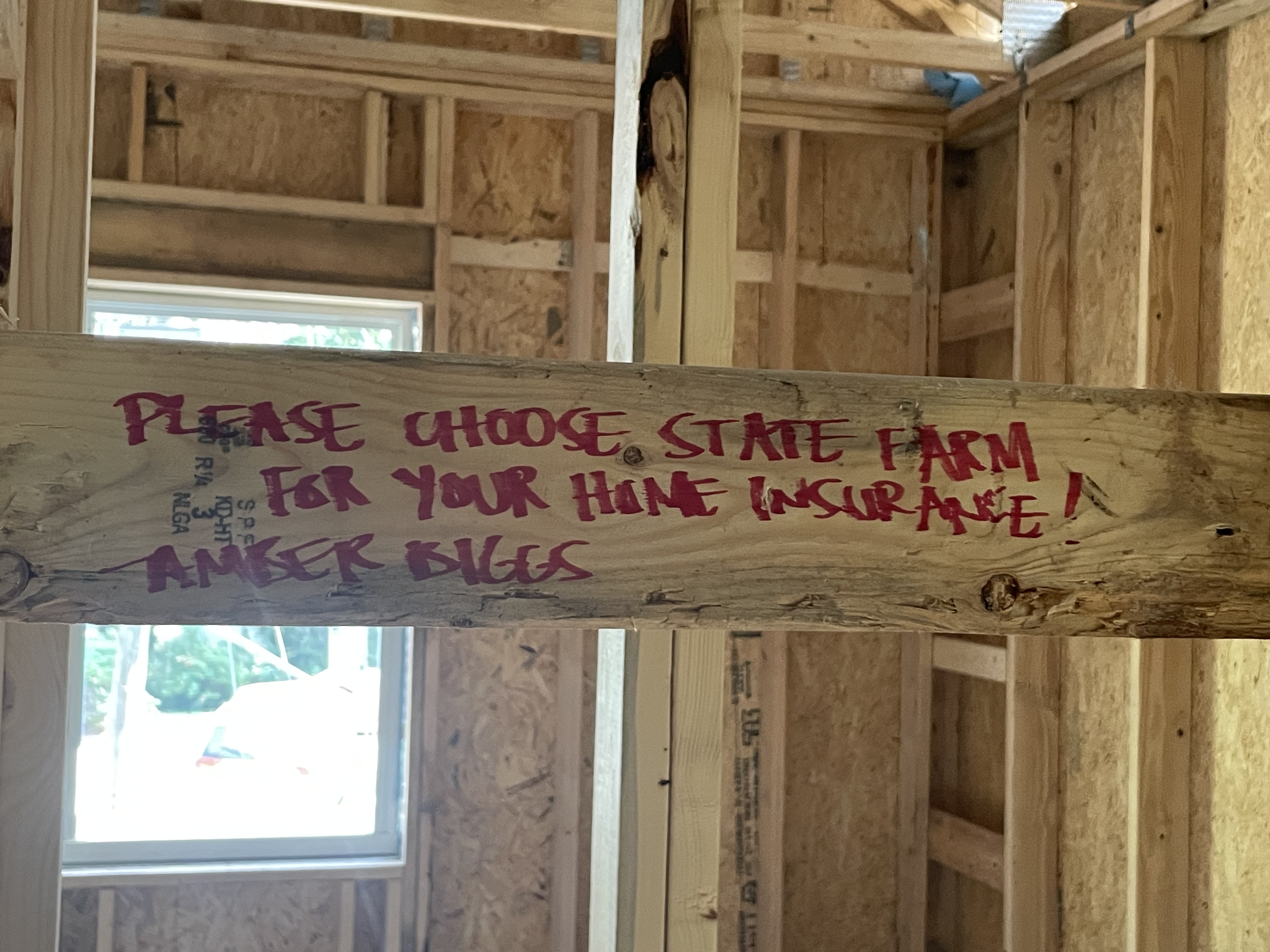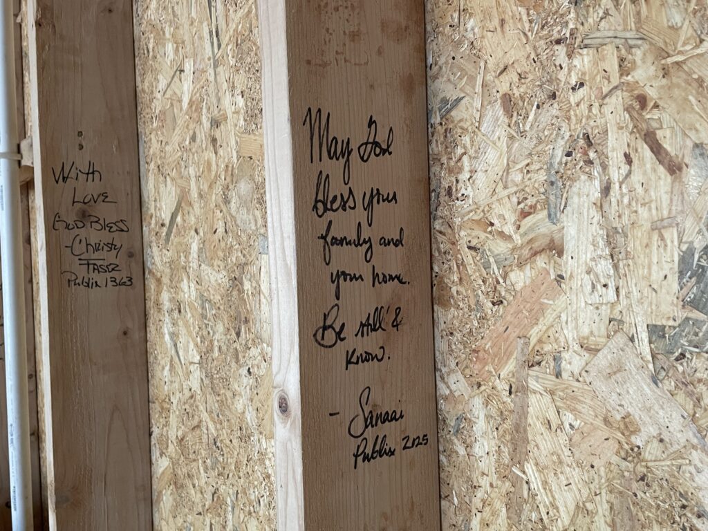 Throughout the build, stud sponsors and volunteers signed messages on the wooden beams—blessings, prayers, and words of encouragement for the future homeowner. Some wished her luck, others left scriptures, and a few even reminded her to “call State Farm” when the time came. Beneath the drywall now rests a living testimony to love, faith, and community—messages forever sealed into the walls of the home.